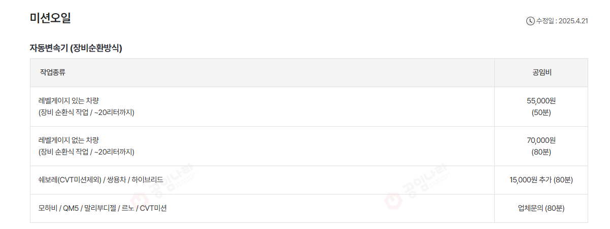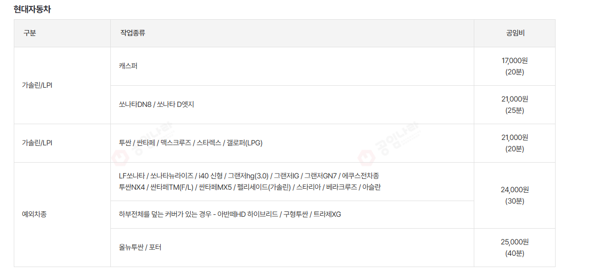 - 위 표는 대표적인 공임비 예시이며, 차종·정비소에 따라 다를 수 있습니다.