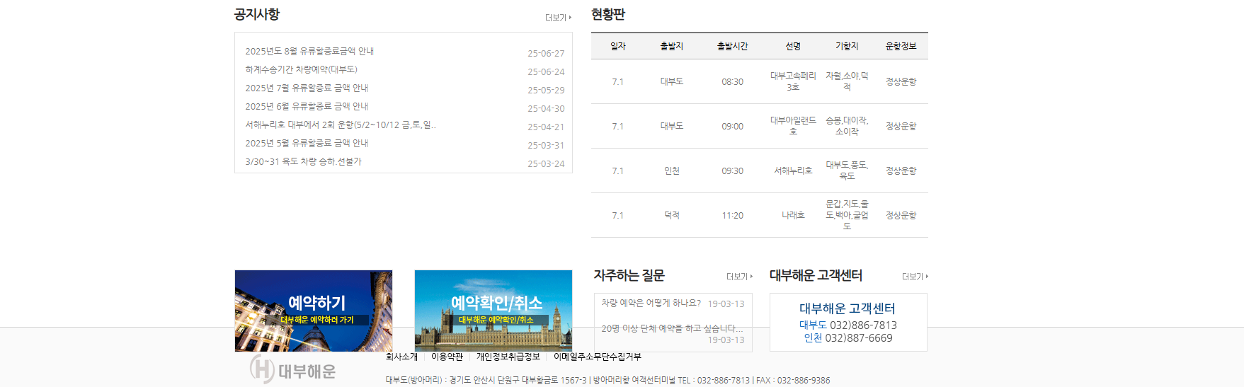 대부해운 홈페이지(www.daebuhw.com)는 인천항과 대부도 방아머리항을 기점으로 서해 여러 섬을 오가는 여객·차량·화물 운송을 담당하는 (유)대부해운의 공식 온라인 서비스입니다.